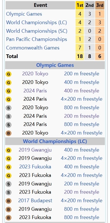 出生于2000年9月7日的蒂特姆斯,是自由泳专项选手,被认为是女子中距离史上最佳运动员之一,她在东京和巴黎奥运会上,总共收获4金3银1铜共8枚奖牌;此外世锦赛(长池)还有4金2银3铜。