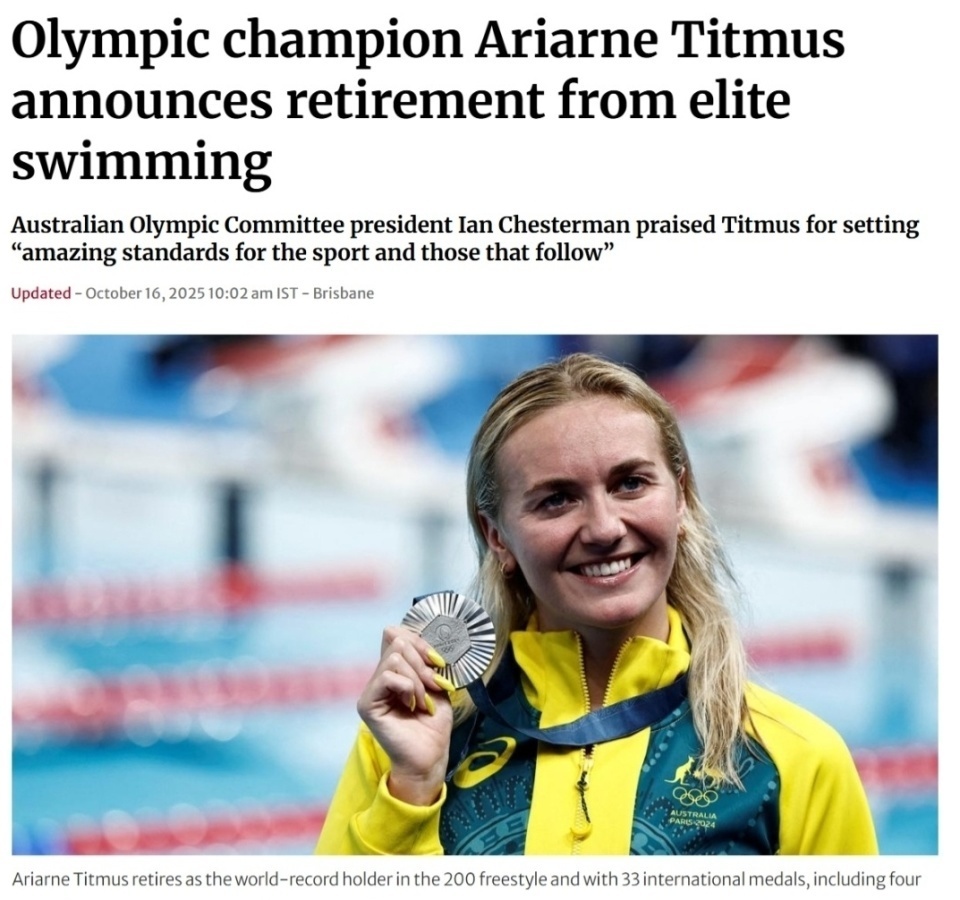 今天早些时候,4枚奥运金牌得主、25岁的澳大利亚游泳名将蒂特姆斯宣布退役,结束了18年泳池征战生涯。